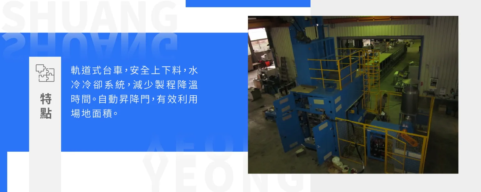 (4) 特點 : 軌道式台車, 安全上下料水冷冷卻系統,減少製程降溫時間自動昇降門,有效利用場地面積