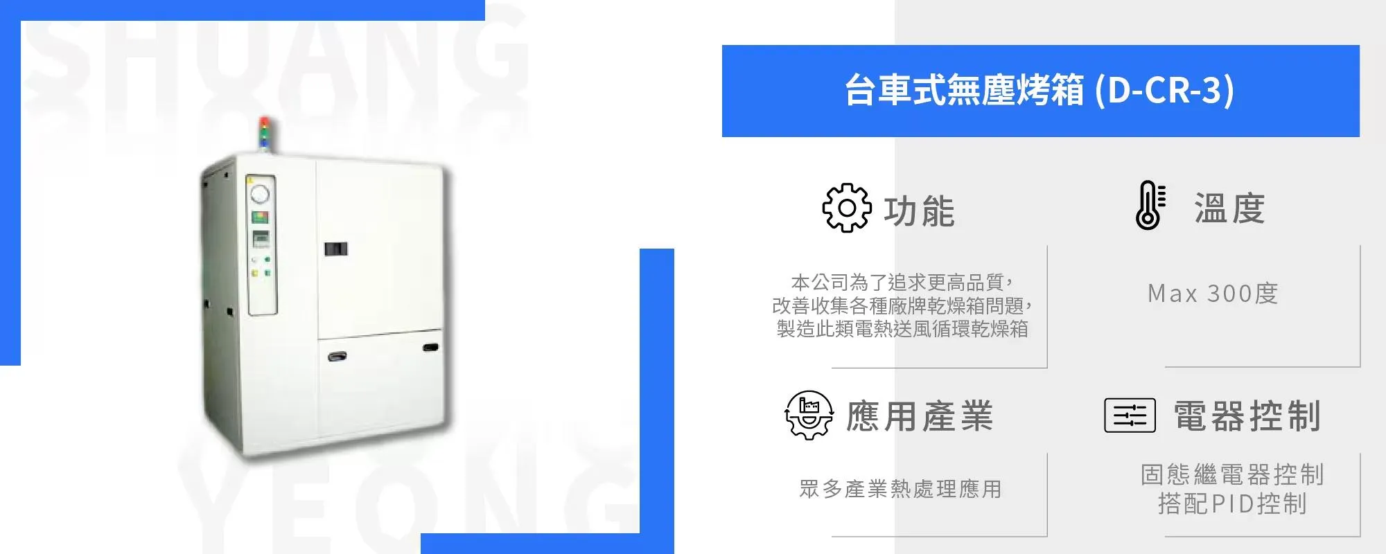 首頁 > 熱處理設備 > 箱型爐系列 > 台車式無塵烤箱 (D-CR-3)