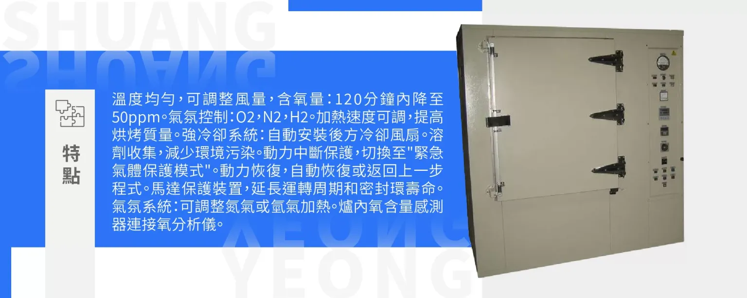 (4) 特點:溫度均勻性佳,出風口可做風量調整,含氧量:120分鐘內降至50ppm,氣氛控制:O2,N2,H2,加熱速度:加熱速度通過PLC可在設定的溫度和加熱時間上算出能提高產品烘烤質量,強冷卻系統:當處理程式趨向結束時程式將自動安裝在爐膛後的間接冷卻風扇,溶劑收集:在爐子背面裝有溶劑收集管和瓶以減少對環境的污染,動力中斷:在運過程中如果動力中斷,程式將跳到”緊急氣體保護模式”,預設的一定數量的空氣或氮氣輸入爐內以保護無氧化產品,動力恢復:當動力中斷或強制返回到最後一步改變程式時間時,程式將繼續程式步驟的運行,馬達保護裝置:馬達和混合氣體輸入管安裝在控制箱內,以延長馬達的運轉周期和密封環的使用壽命,氣氛系統:氮氣或氫氣的加熱是可調的氧含量:在爐內安裝氧含量感測器,將取得的數值傳遞至氧分析儀。